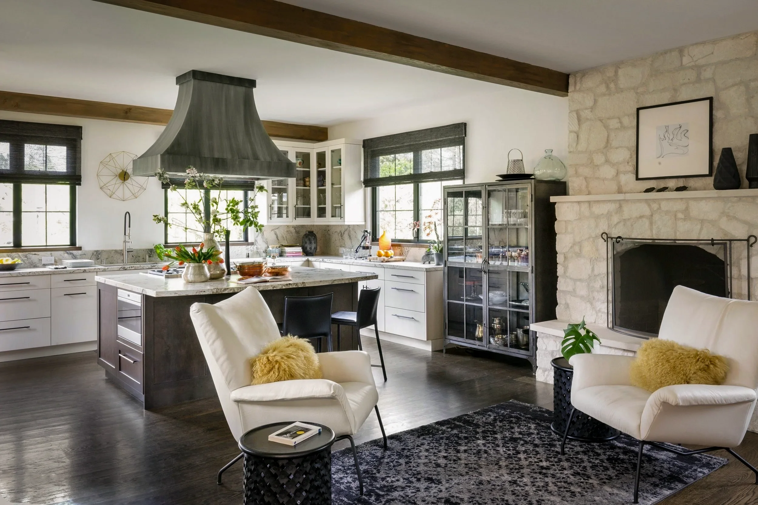 Zinc Range Hood and a Limestone Fireplace Create a Timeless Look